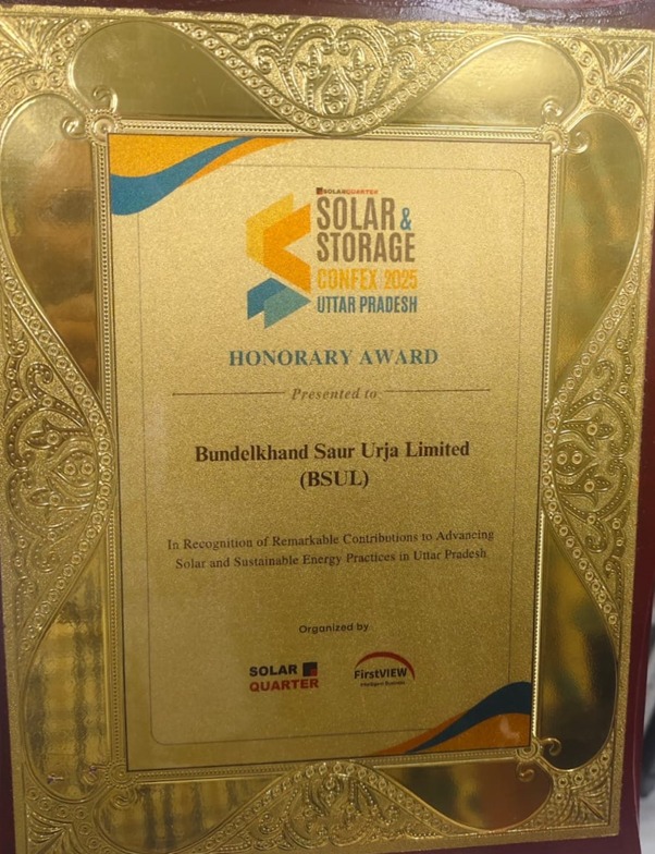 Bundelkhand Saur Urja Ltd has been conferred with an Honorary Award during the Solar & Storage Confex Uttar Pradesh 2025 held at Hotel-Taj Lucknow on October 10, 2025. The award is received by Shri Anil Kumar, CEO, BSUL.